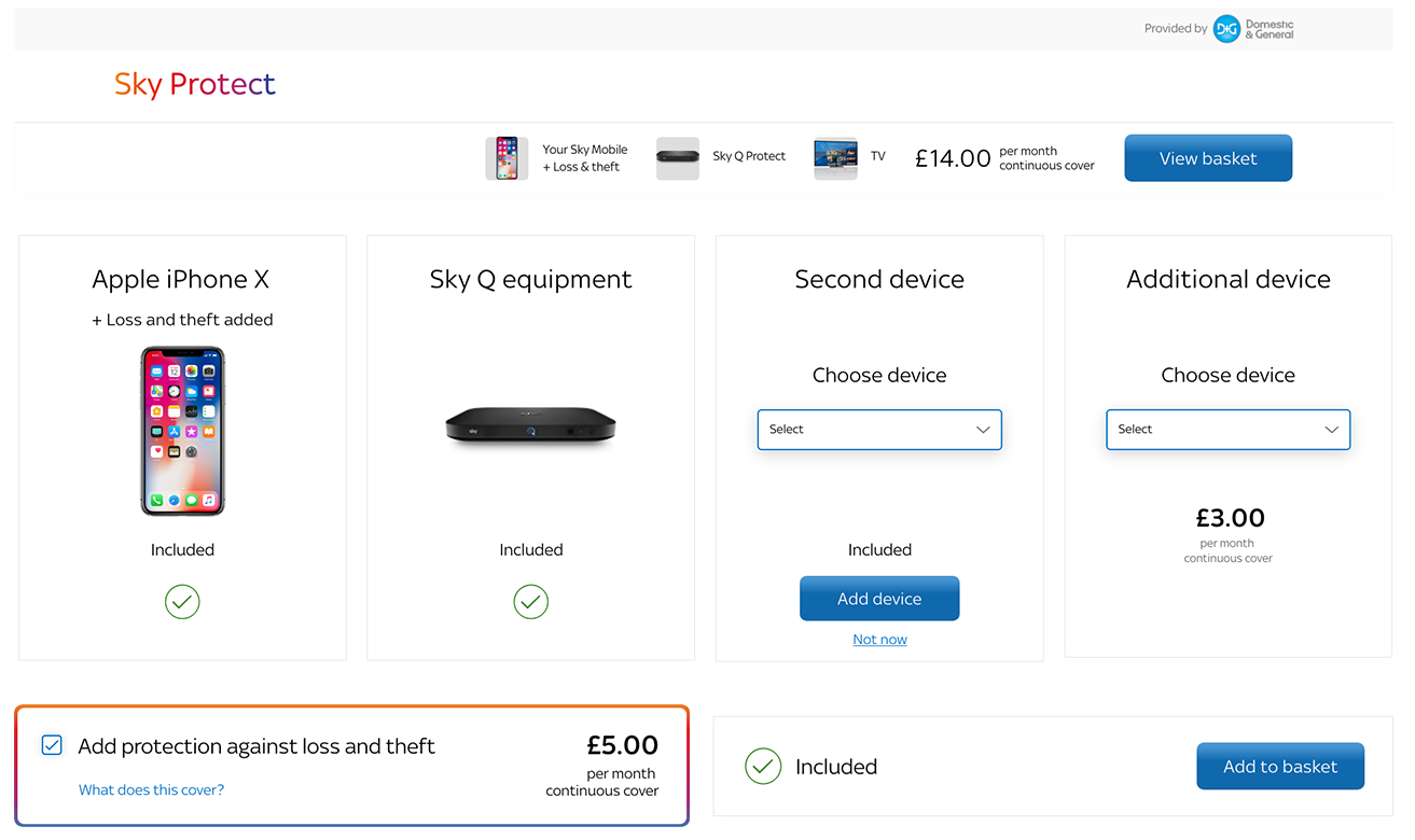A new Sky Protect website needed to offer Sky Mobile customers additional Theft and Loss cover and improve Sky Q customers to add two extra devices to their policy.
